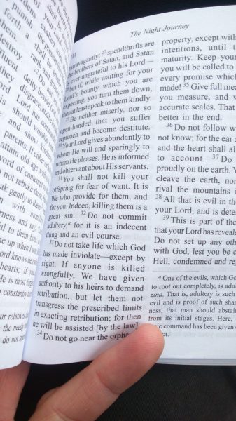Rekao mi je da se u cijelom Kuraanu niti jednom ne pominje nož, da se Muhamed pominje 4, Isus 40, a Mojsije 120 puta. Našao mi je dio iz Kuraana i dao mi da ga pročitam. Pisalo je nešto o pravednim ubistvima. Možda mi nije pokazao najreprezentativniji dio. Procijenite sami (33).